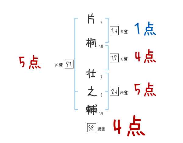 天運![]() | 片桐壮之輔さんの天運は14画の1つ星!人に対して優しいがストレスを溜め込みがち。人間関係のトラブルを避けるよう気をつけましょう。 家系が持つ宿命的な運勢を表します。祖先から受け継いだ苗字ですので自分の力が及びません。家柄を象徴します。 |