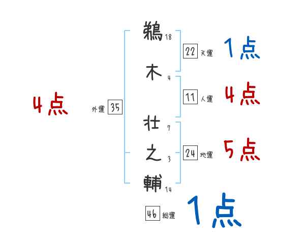 外運![]() | 鵜木壮之輔さんの外運は35画の4つ星!温厚な性格で感受性が高い。穏和な性格で人望が厚い。 生活面を象徴する運勢です。外部から受ける影響力を表し、結婚運、家庭運や職場、環境への順応性を表します。 |