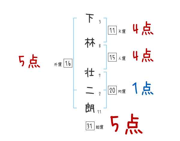 天運![]() | 下林壮二朗さんの天運は11画の4つ星!着実に富や地位を得る幸運な人生。 家系が持つ宿命的な運勢を表します。祖先から受け継いだ苗字ですので自分の力が及びません。家柄を象徴します。 |
