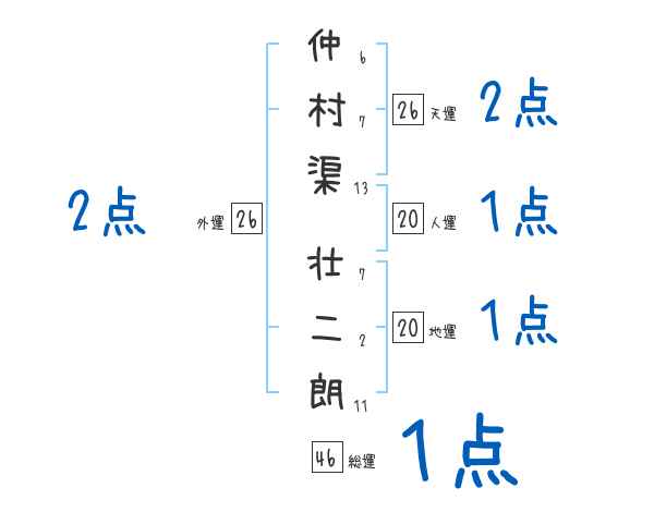 天運![]() | 仲村渠壮二朗さんの天運は26画の2つ星!波瀾万丈かも。信頼できる人を大事にしましょう。 家系が持つ宿命的な運勢を表します。祖先から受け継いだ苗字ですので自分の力が及びません。家柄を象徴します。 |