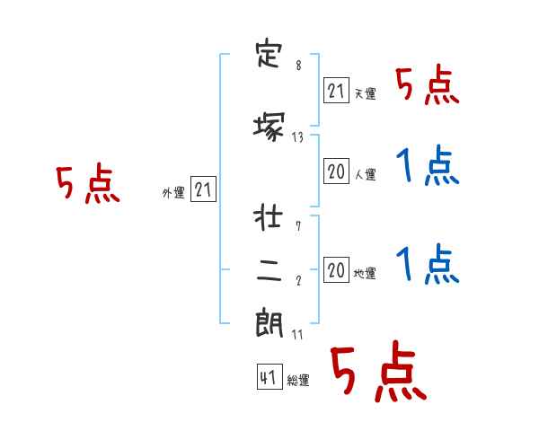 天運![]() | 定塚壮二朗さんの天運は21画の5つ星!統率力がある。独立し成功する。名誉を手に入れる。 家系が持つ宿命的な運勢を表します。祖先から受け継いだ苗字ですので自分の力が及びません。家柄を象徴します。 |