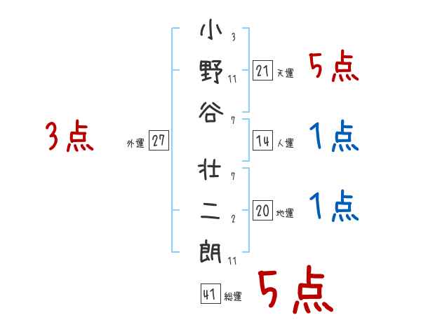 天運![]() | 小野谷壮二朗さんの天運は21画の5つ星!統率力がある。独立し成功する。名誉を手に入れる。 家系が持つ宿命的な運勢を表します。祖先から受け継いだ苗字ですので自分の力が及びません。家柄を象徴します。 |