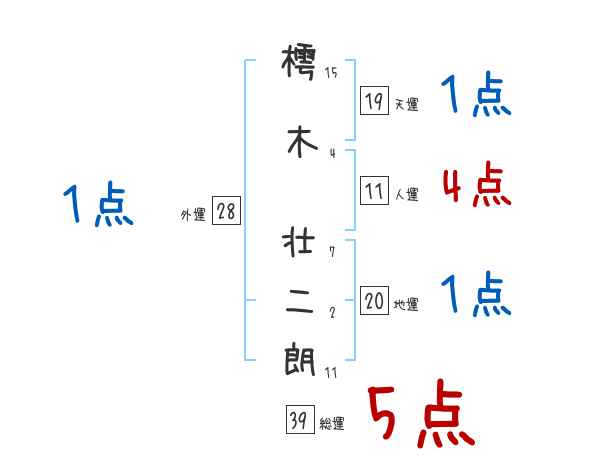 総運![]() | 樗木壮二朗さんの総運は39画の5つ星!社交性に優れ人望が厚い。人の上に立ち成功する。 あなたの人生を表す1番重要な運勢です。生涯を通じて影響する総合運となり、主に50歳以降の晩年期に影響を及ぼします。 |