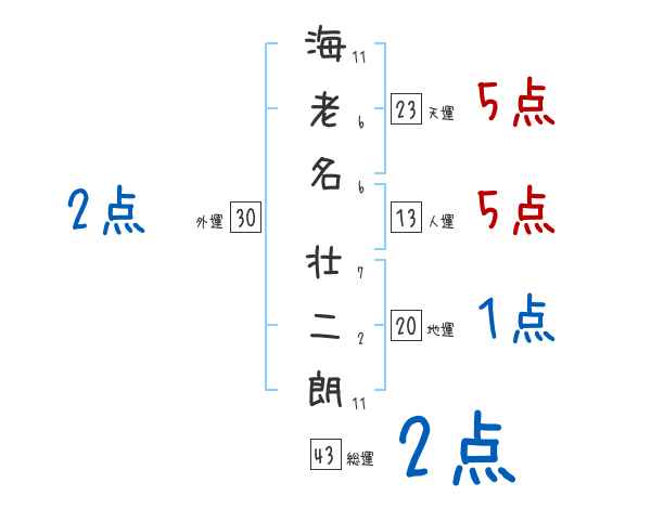 総運![]() | 海老名壮二朗さんの総運は43画の2つ星!頑固な性格で独立心が強いかも。やや非現実的で浪費に注意しましょう。 あなたの人生を表す1番重要な運勢です。生涯を通じて影響する総合運となり、主に50歳以降の晩年期に影響を及ぼします。 |