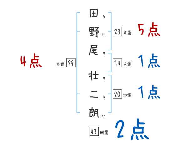 天運![]() | 田野尾壮二朗さんの天運は23画の5つ星!想像力に優れ活力がある。一代で成功し名誉を手に入れる。 家系が持つ宿命的な運勢を表します。祖先から受け継いだ苗字ですので自分の力が及びません。家柄を象徴します。 |