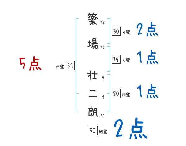 天運![]() | 簗場壮二朗さんの天運は30画の2つ星!浮き沈みの激しさに注意しましょう。 家系が持つ宿命的な運勢を表します。祖先から受け継いだ苗字ですので自分の力が及びません。家柄を象徴します。 |