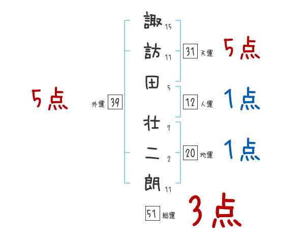 外運![]() | 諏訪田壮二朗さんの外運は39画の5つ星!社交性に優れ人望が厚い。人の上に立ち成功する。 生活面を象徴する運勢です。外部から受ける影響力を表し、結婚運、家庭運や職場、環境への順応性を表します。 |