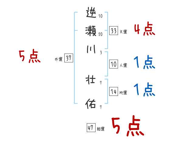 総運![]() | 逆瀬川壮佑さんの総運は47画の5つ星!実力が開花し発展する円満な人生。財に恵まれる。 あなたの人生を表す1番重要な運勢です。生涯を通じて影響する総合運となり、主に50歳以降の晩年期に影響を及ぼします。 |