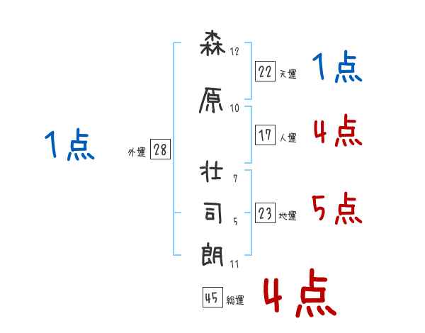 総運![]() | 森原壮司朗さんの総運は45画の4つ星!もくもくと物事を進め達成する。地味な努力家。 あなたの人生を表す1番重要な運勢です。生涯を通じて影響する総合運となり、主に50歳以降の晩年期に影響を及ぼします。 |