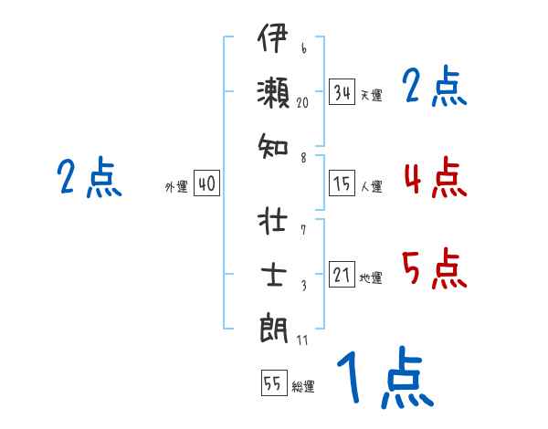 総運![]() | 伊瀬知壮士朗さんの総運は55画の1つ星!欲張りな性格で軽率な行動に注意しましょう。病気に気をつけて。 あなたの人生を表す1番重要な運勢です。生涯を通じて影響する総合運となり、主に50歳以降の晩年期に影響を及ぼします。 |