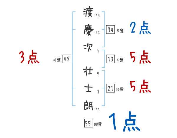 天運![]() | 渡慶次壮士朗さんの天運は34画の2つ星!独創性に優れるが、自尊心が強く災難に注意しましょう。 家系が持つ宿命的な運勢を表します。祖先から受け継いだ苗字ですので自分の力が及びません。家柄を象徴します。 |