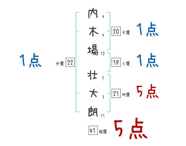外運![]() | 内木場壮大朗さんの外運は22画の1つ星!努力することが苦手ないっぽう手先が器用。芸術性にも優れる。 生活面を象徴する運勢です。外部から受ける影響力を表し、結婚運、家庭運や職場、環境への順応性を表します。 |