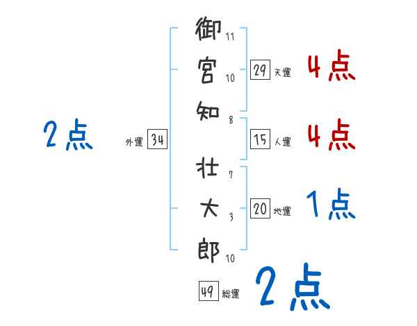 天運![]() | 御宮知壮大郎さんの天運は29画の4つ星!完全主義で才能がある。厳格な心の持ち主。 家系が持つ宿命的な運勢を表します。祖先から受け継いだ苗字ですので自分の力が及びません。家柄を象徴します。 |