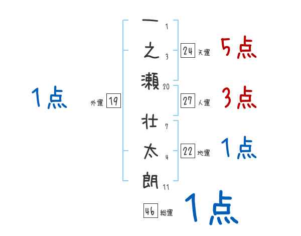 地運![]() | 一之瀬壮太朗さんの地運は22画の1つ星!努力することが苦手ないっぽう手先が器用。芸術性にも優れる。 個性を表す基礎的な運勢です。性格形成や対人関係、行動力など家庭環境に影響されます。主に誕生してから20歳くらいまでの若年期の運勢を表します。 |