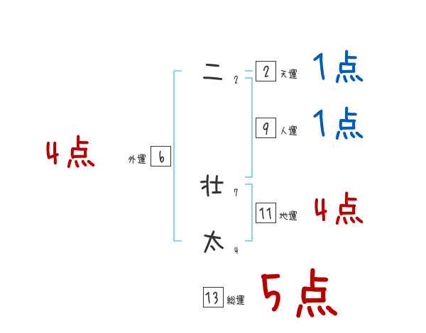 天運![]() | 二壮太さんの天運は2画の1つ星!優しいですが積極性や意思の強さに欠ける傾向があります。家庭環境の乱れに注意しましょう。 家系が持つ宿命的な運勢を表します。祖先から受け継いだ苗字ですので自分の力が及びません。家柄を象徴します。 |