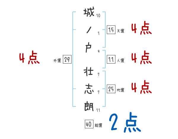 外運![]() | 城ノ戸壮志朗さんの外運は29画の4つ星!完全主義で才能がある。厳格な心の持ち主。 生活面を象徴する運勢です。外部から受ける影響力を表し、結婚運、家庭運や職場、環境への順応性を表します。 |