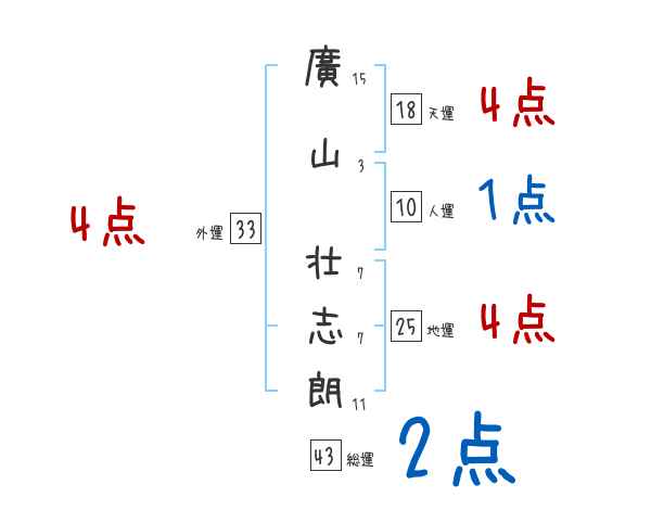 外運![]() | 廣山壮志朗さんの外運は33画の4つ星!権力志向でプライドが高い。勇気があり運を切り開き成功する。 生活面を象徴する運勢です。外部から受ける影響力を表し、結婚運、家庭運や職場、環境への順応性を表します。 |