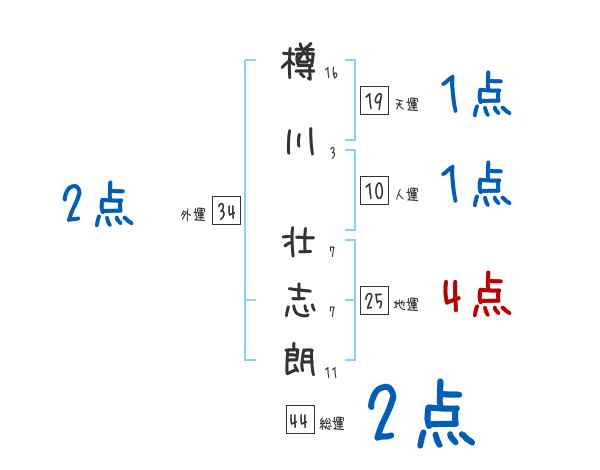 総運![]() | 樽川壮志朗さんの総運は44画の2つ星!誠実で慎重な性格。物事を考えすぎないように注意しましょう。 あなたの人生を表す1番重要な運勢です。生涯を通じて影響する総合運となり、主に50歳以降の晩年期に影響を及ぼします。 |