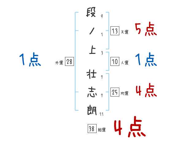 外運![]() | 段ノ上壮志朗さんの外運は28画の1つ星!家庭環境に注意。スポーツで活躍できる能力があるかも。 生活面を象徴する運勢です。外部から受ける影響力を表し、結婚運、家庭運や職場、環境への順応性を表します。 |