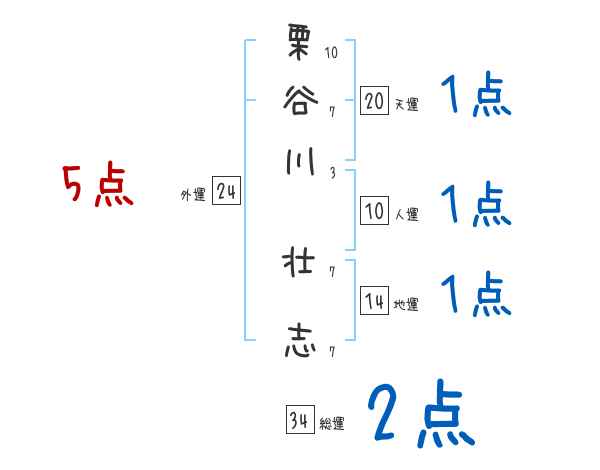 外運![]() | 栗谷川壮志さんの外運は24画の5つ星!家庭運が良く順調な人生。金運にも恵まれる。 生活面を象徴する運勢です。外部から受ける影響力を表し、結婚運、家庭運や職場、環境への順応性を表します。 |