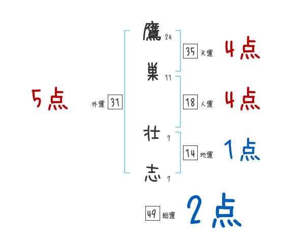 天運![]() | 鷹巣壮志さんの天運は35画の4つ星!温厚な性格で感受性が高い。穏和な性格で人望が厚い。 家系が持つ宿命的な運勢を表します。祖先から受け継いだ苗字ですので自分の力が及びません。家柄を象徴します。 |