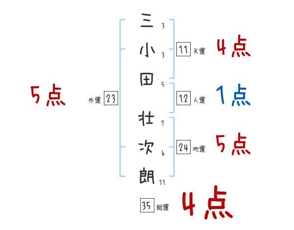 総運![]() | 三小田壮次朗さんの総運は35画の4つ星!温厚な性格で感受性が高い。穏和な性格で人望が厚い。 あなたの人生を表す1番重要な運勢です。生涯を通じて影響する総合運となり、主に50歳以降の晩年期に影響を及ぼします。 |