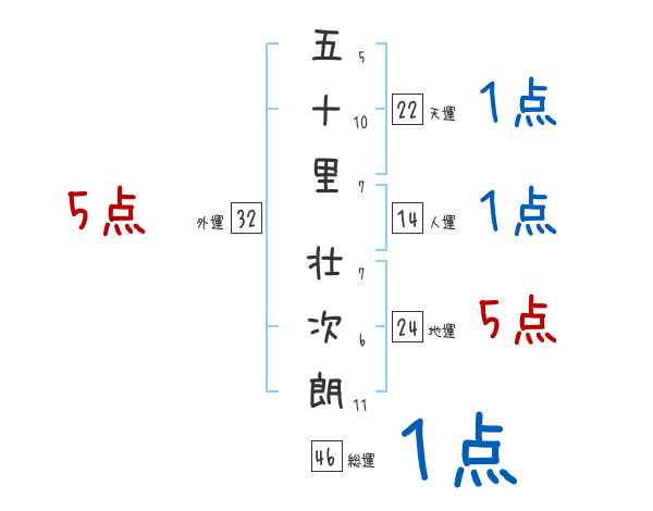 外運![]() | 五十里壮次朗さんの外運は32画の5つ星!柔軟性があり成功する。チャンスが多く金運が良い。 生活面を象徴する運勢です。外部から受ける影響力を表し、結婚運、家庭運や職場、環境への順応性を表します。 |