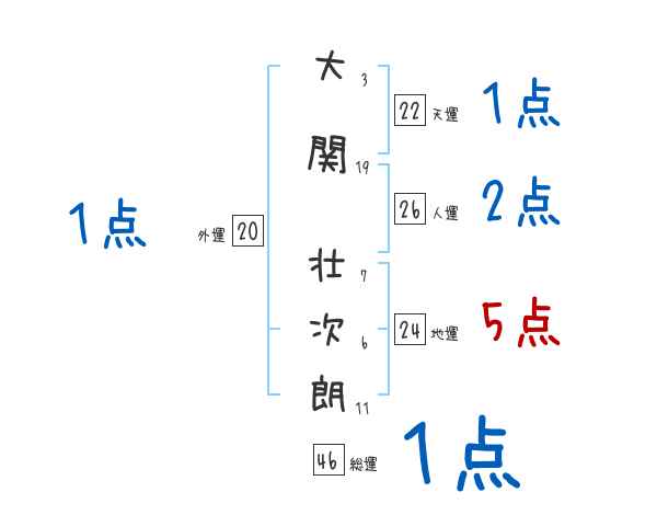 総運![]() | 大関壮次朗さんの総運は46画の1つ星!迷走することが多く苦労するかも。目先のことにとらわれないように。 あなたの人生を表す1番重要な運勢です。生涯を通じて影響する総合運となり、主に50歳以降の晩年期に影響を及ぼします。 |