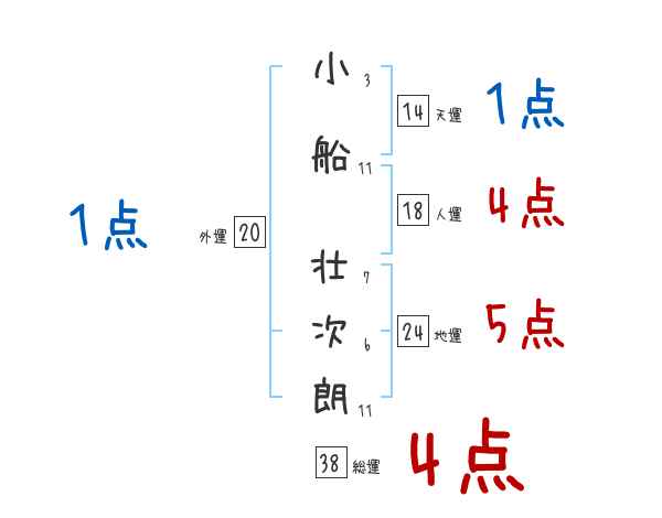 天運![]() | 小船壮次朗さんの天運は14画の1つ星!人に対して優しいがストレスを溜め込みがち。人間関係のトラブルを避けるよう気をつけましょう。 家系が持つ宿命的な運勢を表します。祖先から受け継いだ苗字ですので自分の力が及びません。家柄を象徴します。 |