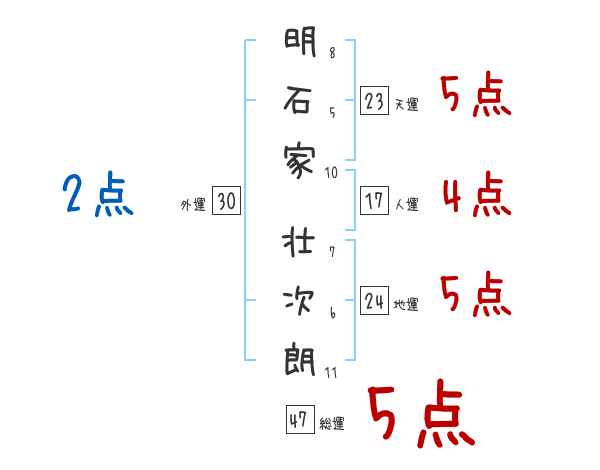 天運![]() | 明石家壮次朗さんの天運は23画の5つ星!想像力に優れ活力がある。一代で成功し名誉を手に入れる。 家系が持つ宿命的な運勢を表します。祖先から受け継いだ苗字ですので自分の力が及びません。家柄を象徴します。 |