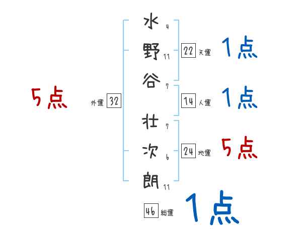 外運![]() | 水野谷壮次朗さんの外運は32画の5つ星!柔軟性があり成功する。チャンスが多く金運が良い。 生活面を象徴する運勢です。外部から受ける影響力を表し、結婚運、家庭運や職場、環境への順応性を表します。 |