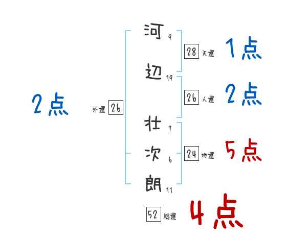 天運![]() | 河辺壮次朗さんの天運は28画の1つ星!家庭環境に注意。スポーツで活躍できる能力があるかも。 家系が持つ宿命的な運勢を表します。祖先から受け継いだ苗字ですので自分の力が及びません。家柄を象徴します。 |