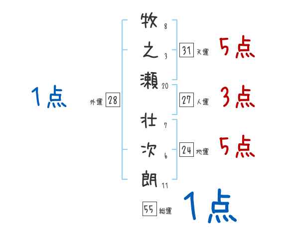 外運![]() | 牧之瀬壮次朗さんの外運は28画の1つ星!家庭環境に注意。スポーツで活躍できる能力があるかも。 生活面を象徴する運勢です。外部から受ける影響力を表し、結婚運、家庭運や職場、環境への順応性を表します。 |