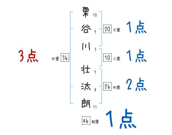 外運![]() | 栗谷川壮汰朗さんの外運は36画の3つ星!先見性が豊かです。多少神経質で苦労することも。 生活面を象徴する運勢です。外部から受ける影響力を表し、結婚運、家庭運や職場、環境への順応性を表します。 |