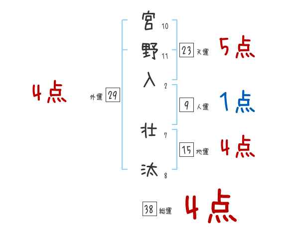 天運![]() | 宮野入壮汰さんの天運は23画の5つ星!想像力に優れ活力がある。一代で成功し名誉を手に入れる。 家系が持つ宿命的な運勢を表します。祖先から受け継いだ苗字ですので自分の力が及びません。家柄を象徴します。 |