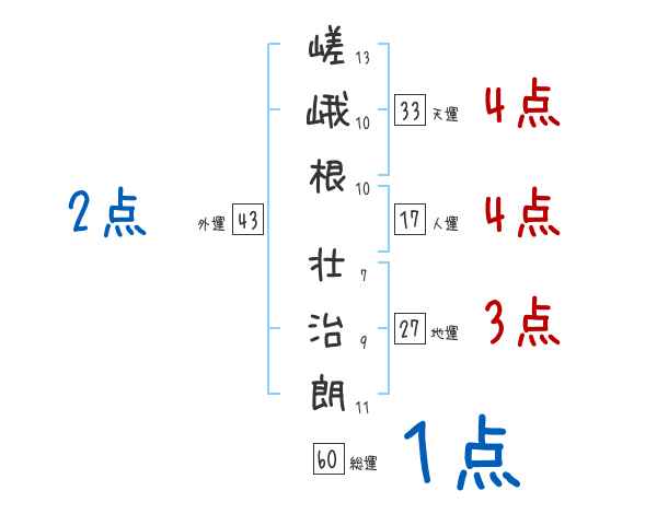 天運![]() | 嵯峨根壮治朗さんの天運は33画の4つ星!権力志向でプライドが高い。勇気があり運を切り開き成功する。 家系が持つ宿命的な運勢を表します。祖先から受け継いだ苗字ですので自分の力が及びません。家柄を象徴します。 |