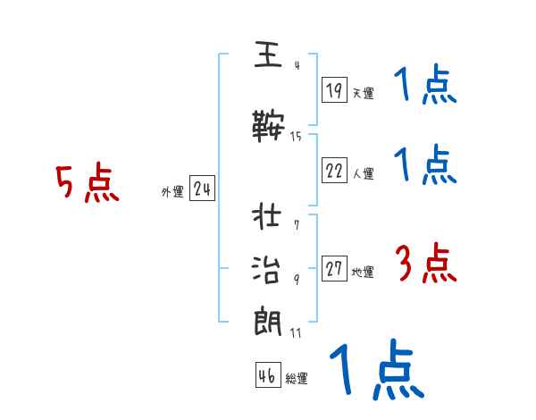 外運![]() | 王鞍壮治朗さんの外運は24画の5つ星!家庭運が良く順調な人生。金運にも恵まれる。 生活面を象徴する運勢です。外部から受ける影響力を表し、結婚運、家庭運や職場、環境への順応性を表します。 |