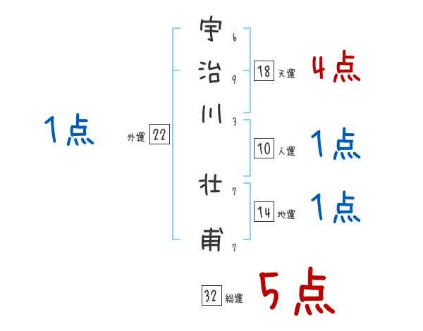 総運![]() | 宇治川壮甫さんの総運は32画の5つ星!柔軟性があり成功する。チャンスが多く金運が良い。 あなたの人生を表す1番重要な運勢です。生涯を通じて影響する総合運となり、主に50歳以降の晩年期に影響を及ぼします。 |