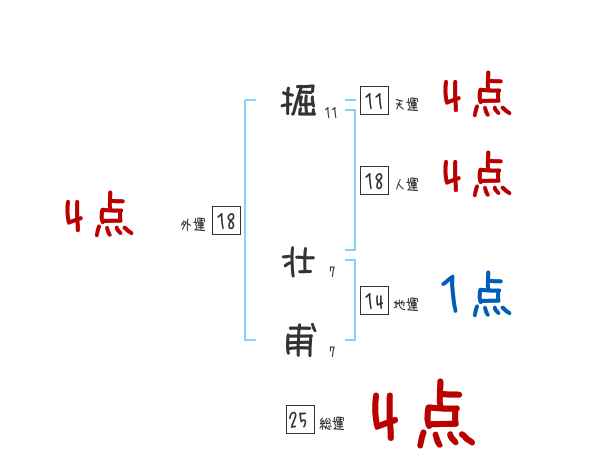 人運![]() | 掘壮甫さんの人運は18画の4つ星!情熱的で剛気。忍耐力があり信頼される。 性格や才能などを表す2番目に重要な運勢です。人間関係や協調性、社会的な成功に影響します。主に20歳から50歳ぐらいまでの中年期の運勢を表します。 |