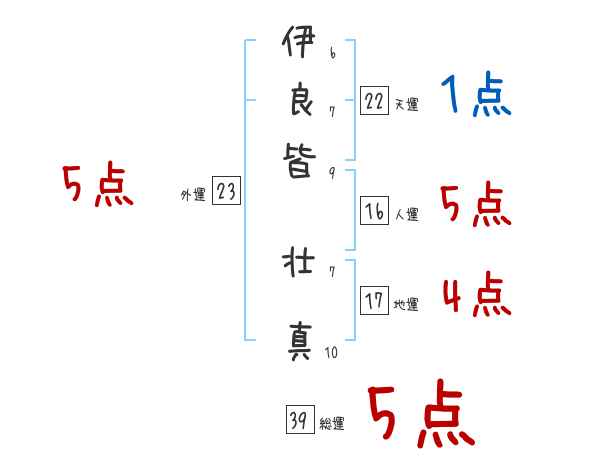 人運![]() | 伊良皆壮真さんの人運は16画の5つ星!人望が厚く大きく発展する。逆転成功が見える。 性格や才能などを表す2番目に重要な運勢です。人間関係や協調性、社会的な成功に影響します。主に20歳から50歳ぐらいまでの中年期の運勢を表します。 |