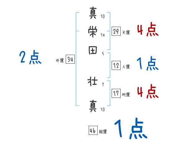 天運![]() | 真栄田壮真さんの天運は29画の4つ星!完全主義で才能がある。厳格な心の持ち主。 家系が持つ宿命的な運勢を表します。祖先から受け継いだ苗字ですので自分の力が及びません。家柄を象徴します。 |