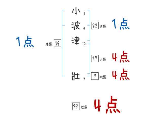 天運![]() | 小波津壯さんの天運は22画の1つ星!努力することが苦手ないっぽう手先が器用。芸術性にも優れる。 家系が持つ宿命的な運勢を表します。祖先から受け継いだ苗字ですので自分の力が及びません。家柄を象徴します。 |