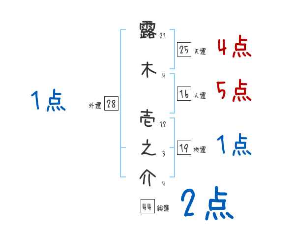 総運![]() | 露木壱之介さんの総運は44画の2つ星!誠実で慎重な性格。物事を考えすぎないように注意しましょう。 あなたの人生を表す1番重要な運勢です。生涯を通じて影響する総合運となり、主に50歳以降の晩年期に影響を及ぼします。 |