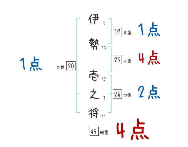 地運![]() | 伊勢壱之将さんの地運は26画の2つ星!波瀾万丈かも。信頼できる人を大事にしましょう。 個性を表す基礎的な運勢です。性格形成や対人関係、行動力など家庭環境に影響されます。主に誕生してから20歳くらいまでの若年期の運勢を表します。 |
