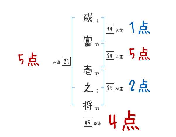 天運![]() | 成富壱之将さんの天運は19画の1つ星!優れた才能を持ちますが、協調性が足りないことも。周りの人と協力する事を意識しましょう。 家系が持つ宿命的な運勢を表します。祖先から受け継いだ苗字ですので自分の力が及びません。家柄を象徴します。 |