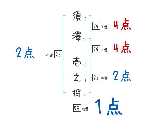 外運![]() | 須澤壱之将さんの外運は26画の2つ星!波瀾万丈かも。信頼できる人を大事にしましょう。 生活面を象徴する運勢です。外部から受ける影響力を表し、結婚運、家庭運や職場、環境への順応性を表します。 |