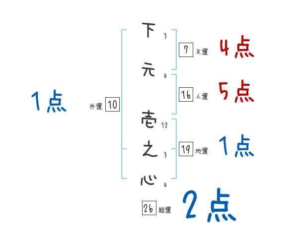 総運![]() | 下元壱之心さんの総運は26画の2つ星!波瀾万丈かも。信頼できる人を大事にしましょう。 あなたの人生を表す1番重要な運勢です。生涯を通じて影響する総合運となり、主に50歳以降の晩年期に影響を及ぼします。 |