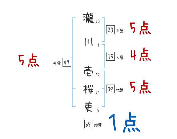 | 外運  | 瀧川壱桜吏さんの外運は47画の5つ星!実力が開花し発展する円満な人生。財に恵まれる。生活面を象徴する運勢です。外部から受ける影響力を表し、結婚運、家庭運や職場、環境への順応性を表します。 |