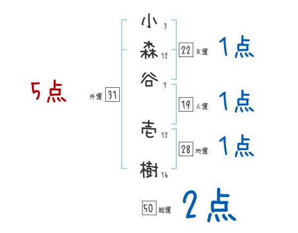 天運![]() | 小森谷壱樹さんの天運は22画の1つ星!努力することが苦手ないっぽう手先が器用。芸術性にも優れる。 家系が持つ宿命的な運勢を表します。祖先から受け継いだ苗字ですので自分の力が及びません。家柄を象徴します。 |