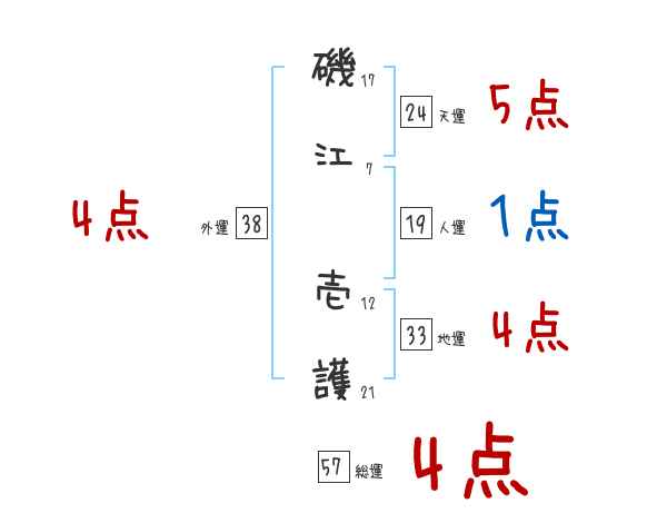 外運![]() | 磯江壱護さんの外運は38画の4つ星!温厚な性格で技術的な才能を発揮する。職人的な仕事に向いている。 生活面を象徴する運勢です。外部から受ける影響力を表し、結婚運、家庭運や職場、環境への順応性を表します。 |